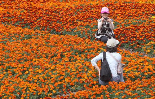 台气象部门表示,6日白天全台多云到晴,傍晚受锋面影响,北部、东北部云量增多,有零星降雨机会。图为民众趁着好天气,欣赏大片美丽的花海。 图片来源:“中央社”