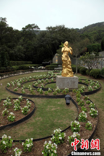 在台北金宝山邓丽君墓园——“筠园”里,一片点缀着音符微雕的草地上,邓小姐裙裾飘飘的雕塑泛着金光,一如她的歌声已是一代人金色的记忆。中新社记者 关向东 摄