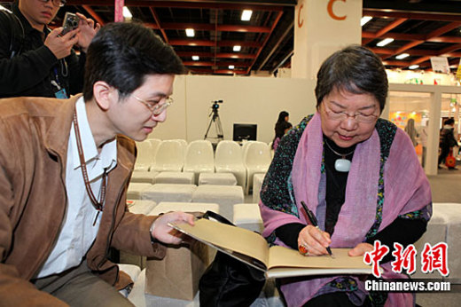 2月10日,台湾著名诗人、散文家席慕容在接受中新社记者专访时透露,她将于今年7月出版第7本个人诗集,名曰《以诗之名》。图为当日,席慕容为一名收集有她早期作品的读者签名。中新社记者 董会峰 摄