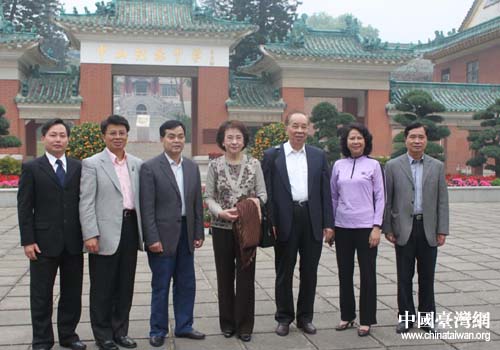 中山市副市长韩泽生(右二)、中山市政府副秘书长郑向荣(左一)、中山市台务局局长黄全欢(右一)等陪同林澄枝女士、谢孟雄先生等参观中山纪念中学时合影(图片来源:中山市台办)