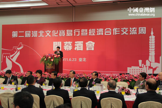 中国台湾网6月23日台北消息 第二届“河北文化宝岛行暨经济合作交流周”活动开幕酒会在台北世贸中心举行,河北省委常委刘永瑞主持开幕式。河北代表团成员及台湾各界知名人士共300余人参加开幕式。
