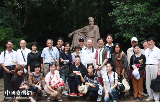 13日,情系巴蜀—两岸文化联谊行活动走进眉山三苏祠。图为台湾嘉宾在苏轼雕像前合影。(中国台湾网 赵辉 摄)