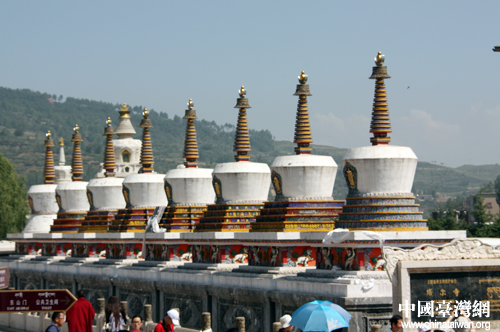 塔尔寺广场矗立的如来八塔,用来赞颂佛祖释迦牟尼一生的八大功德。(中国台湾网 杨云涛 摄)