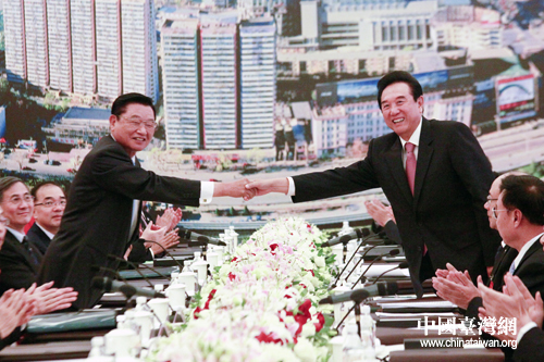 两岸两会领导人第七次会谈于20日上午9时在天津迎宾馆举行,海协会会长陈云林与台湾海基会董事长江丙坤握手致意。(中国台湾网 陈佳慧 摄)