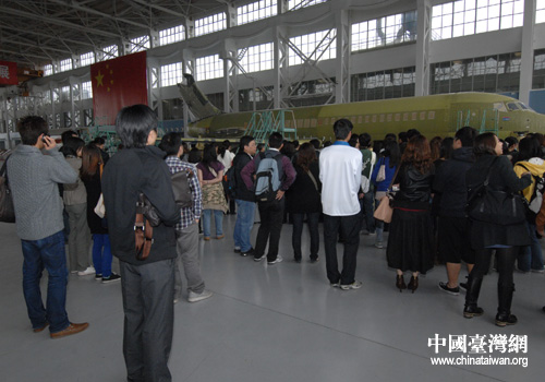 参观我国自行设计制造的大型民用客机(上海市台办 葛凤章 摄)