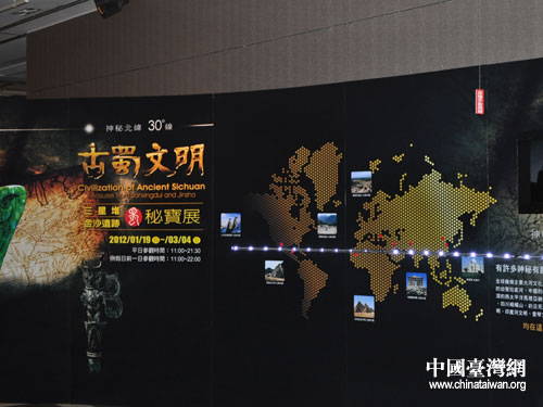 台北是“神秘北纬30度线——三星堆、金沙古蜀文明秘宝展”的第一站,展至3月4日,此后还将到台中、高雄巡回展出,于2012年6月10日结束。据介绍,展览门票已经有近5万人次预订,主办方预计,整个展览将吸引40万以上台湾民众参观展览。
