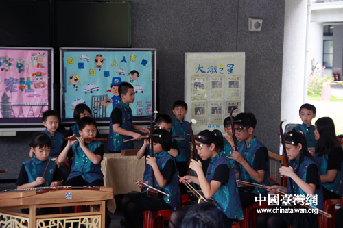 5月29日下午,来自台中市大墩小学民族乐团的小朋友们为参访团演奏了一首古典韵味的乐器协奏曲。(中国台湾网 李丹 摄)