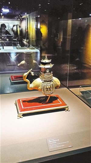 这件“英国十八世纪铜镀金仙鹤驮亭式表”由伦敦著名钟表匠James Cox制造,仙鹤腹中安置音乐机械装置,启动时可演奏四支乐曲。