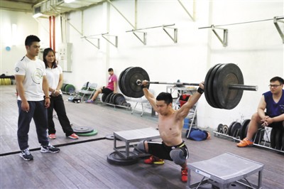 石智勇(左一)和邓薇(左二)观看台湾体育大学举重学生训练