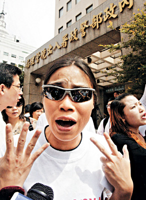 图:许多前来办理手续的大陆新娘在“内政部”出入境管理局门口临时加入抗议阵容,激动地向媒体控诉在台湾受到当局的歧视。