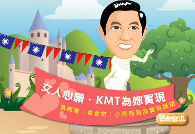 据台湾媒体报道,马英九的英挺帅气迷倒不少女性,早已是众所皆知。现在,在国民党网站上出现了这样的宣传活动,如果答对了11个相关问题,并许下妇女节的心愿,最后获得第一名的女性,3月8日当天便可以与马英九相会,并由他亲自帮忙实现愿望。