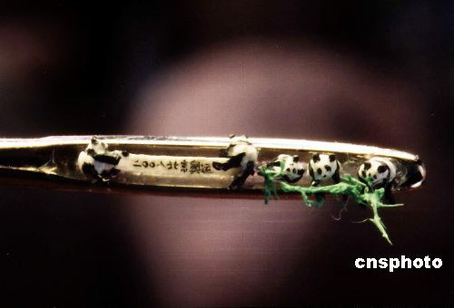 透过放大镜,记者才得以窥见陈逢显新作的无穷奥妙。国宝大熊猫是一件与二○○八北京奥运有关的作品:用树脂微雕成的五只平均尺寸只有零点七毫米的大熊猫,黑白相间、憨态可掬。它们或在争吃细嫩、翠绿的竹子,或在玩耍展示刻有“二○○八北京奥运”字样的横幅。这一住在针孔中的大熊猫家族被陈逢显刻画得活灵活现。陈逢显笑称,三只正在吃竹子的小大熊猫还叫着“长大也要参加奥运”呢。他说,这是他用了六个月的时间才完成的作品。