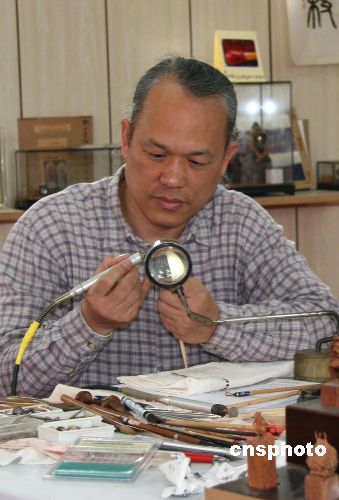 陈逢显的毫芒雕刻馆在台北独具特色。据介绍,一百五十多平方米的展馆陈列着陈逢显呕心沥血创作的近百件微雕作品。那些凝结了艺术家全部造诣的作品,都须通过放大镜才能窥见端倪。陈逢显说,此次带来的两件作品可以说是他艺术生涯至今,令他最满意的作品。