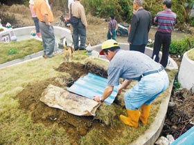 昨天上午,大批万丹村民到公墓查看,南投市王木川的坟墓被挖了一个洞,棺材也被敲破,儿子王宗庆看了很难过。因为下雨,王宗庆找来塑胶板盖在墓地上。他说,父亲九二一地震后去世,他每星期都来整理父亲的墓园,最近还种上草皮,没想到竟然被盗。