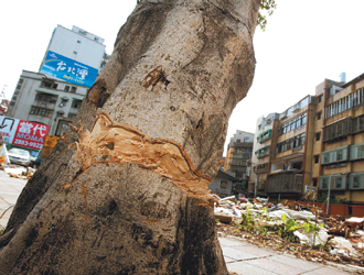 据台湾《联合晚报》报道,台北市“议员”接获民众检举,承德路四段某建地行道树遭“齐平断根”,更有一株超过三层楼高的行道树遭到“环状剥皮”,濒临死亡。另外,某街的高级建案尚未开工,建商已悄悄将树木“断枝”,再把锯断处包裹起来。像这样伤痕累累的行道树,在台北市随处可见。