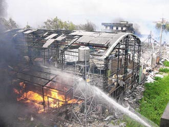 苗栗县后龙镇地下爆竹工厂爆炸,以钢架及铁皮搭建的厂房被夷为平地,消防人员以水柱扑灭余火。《联合报》记者罗缃纶摄