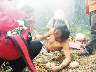 一名伤者满脸鲜血,赤裸着上身,在现场哀嚎,救难人员正准备将他抬上担架送医。《联合报》记者段鸿裕摄