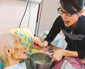 90岁的谢刘完妹生前住在护理之家,孙女谢任坪哄着祖母吃稀饭。