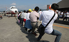 据“中央社”报道,远航宣布举办拉飞机活动后,13天共吸引3000人次上网预测。拉飞机活动上午登场,分成民众组与网络预测关注的远航员工组等两场,平常需要40辆车才拖得动的飞机重量,拔河选手从15人开始试拉,逐次加入5人,选手分成两列,从机鼻左右两侧,用力将机身向前拔行。