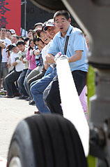 员工组则显得有备而来,穿着整齐制服,当30名选手还拉不动时,远航董事长乐大信和总经理陈尚群也加入拔河,直到40人终于拖动飞机,多位选手大呼好玩。