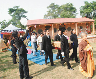 殡葬公司人员为法胖“接体”、洗身、换衣、竖灵、冰存,由六名法师轮流诵经,并选定安葬在台南县新化镇一家宠物乐园。