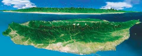 透过卫星影像,观者可由任意角度看见湛蓝海洋中的绿色台湾。以往由南北角度看台湾,台湾像绿色“蕃薯”,现在我们从地平线角度更能看见台湾山棱的变换,发挥想象力,台湾的侧脸还像只迷你“鳄鱼”,大屯火山是鳄鱼突出的鼻孔,峥嵘山棱是鳄鱼的背,恒春半岛是鳄鱼摆动的尾巴,乘着黑潮在海洋中北游而去。
