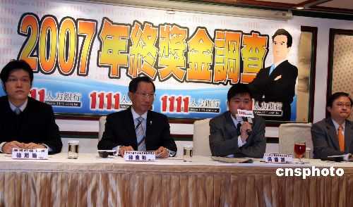 一月二十八日,台湾1111人力银行在台北发布其最新完成的二○○七年终奖金大调查,结果显示:与上一年度仅一成三受访者没有年终可领相比,二○○七年有超过三成上班族确定领不到任何年终,增长一百五十三个百分点。一成五企业不发放二○○七年终奖,不赚钱、景气差是主要原因。 中新社发 孙自法 摄