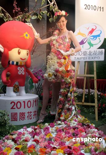 2月1日,2010年台北国际花卉博览会吉祥物及LOGO揭晓。吉祥物名为“花儿丝乐团”(模特左),是一组由四季鲜花抽象来的卡通精灵组成的音乐组合团。LOGO由五种颜色的五个人形花瓣组合而成(模特右)。 中新社发 徐长安 摄