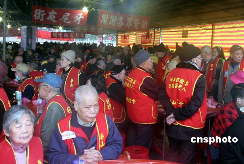 中新社台北二月二日电,年终岁末,全台湾正在流行尾牙宴。二日中午,今年最大的一场尾牙宴在台北松山烟厂席开七百桌。七千多流浪街友及独居老人共同围炉,迎接农历新年。