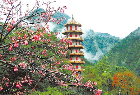中国台湾网2月6日消息 樱花开了!据台湾“中时电子报”报道,台湾中横公路天祥的樱花在低温中盛开。青山环绕下,樱花在祥德寺的宝塔前格外抢眼。今年春节期间,太鲁阁公园开办游园专车,让游客可以轻松乘车进太鲁阁到天祥赏花,再走进祥德寺为新的一年祈求好运道。