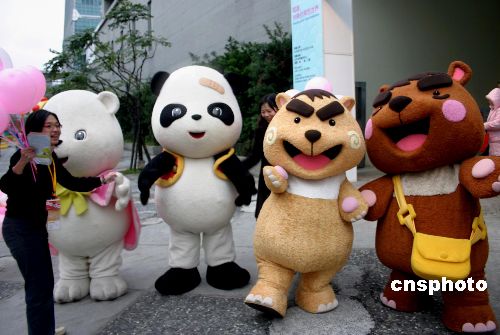 为推销书展,有业者在展馆门口以道具扮演“熊猫”吸引观众。中新社发 徐长安 摄