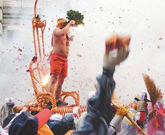 元宵炸寒单爷活动越夜越疯狂,炮手拿着鞭炮往寒单爷神轿丢。 联合报图