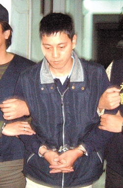 花莲警方破获男子陈柏诚(中)迷魂盗案,并劫财劫色,全台至少约有11人受害。(台湾《中国时报》图;洪祥和摄)