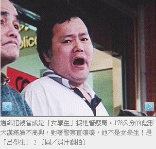 吕学生被当成是“女学生”捉进警察局,身高178厘米的彪形大汉满脸不高兴,他对着警察直嚷嚷,说他不是“女学生”。