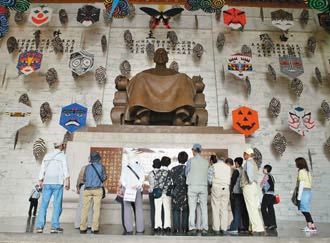 台当局推行“去蒋”政策,台北中正纪念堂的蒋介石铜像被各式风筝遮挡。4月1日起风筝等将全部拆除,还大厅原貌。(图:台湾《联合报》)