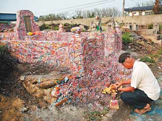 绰号铁牛的何季诺,擅长水墨画、陶版画、版画及公共艺术陶艺创作。因妈妈的坟用塑钢土补过,苦思如何掩饰补痕,灵机一动,“来彩绘、当成创作好了!”3月下旬起,只要天气好,他就拎着油漆桶到妈妈坟前作画,自承:“我的想法异于常人。”