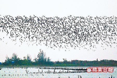 据台湾媒体报道,台南县北门乡井仔脚的舄湖近月来出现约3万只黑腹燕鸥栖息,每到黄昏时分,大批黑腹燕鸥在天空盘旋集结后,贴着水面来回飞舞,形成遮天蔽日般壮观场面,吸引鸟友聚集观赏。