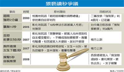 “如此会引起更多人存着侥幸心态,认为猥亵不超过十秒就无罪。”妇女新知基金会董事长范云指出,在前述荒谬案件后,有名女子在电梯遭色狼捏臀,女子要求道歉,对方竟发表“捏臀5秒无罪论”,叫她“要告去告,反正法院会判无罪”,就是法官落伍的后遗症。