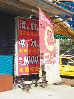 色情小吃店贴出大幅清凉女郎海报,吸引酒客上门。(图:台湾《联合报》)