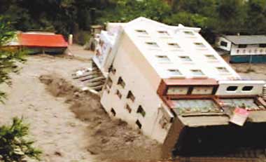 中新网9月16日电 台湾南投县庐山塔罗湾溪暴涨,知名的庐山温泉风景区遭空前劫难,芦山宾馆被土石淹没,片瓦无存;五层楼的绮丽饭店整座倒在塔罗湾溪中,玉池饭店地基淘空岌岌可危,幸而27名游客获安置,唯有一宾馆女员工失踪。