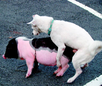 土狗“拉奇”骑上麝香猪“曼尼”,在马路上快活,麝香猪的主人一度气得要告狗主纵容土狗性侵。图片来源:台湾《联合报》