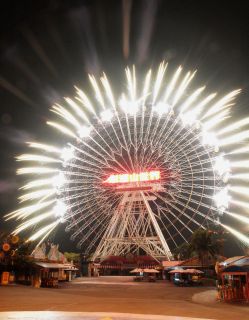 在摩天轮上施放烟火,将摩天轮设计成巨大灿烂的烟火球,创造出的视觉效果令人惊艳赞叹。云林县一处大型游乐场为迎接2009年新年,跨年夜当晚将推出烟火秀,15日晚上先行试放时,美丽景象就让现场民众忍不住发出阵阵惊呼。