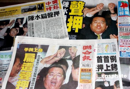 11月12日,台湾所有报纸都在头版及其它版面重要位置刊登陈水扁被声押的消息及相关新闻报道。台湾检方于11日向台北地方法院提出声请羁押,陈水扁曾声称被法警殴打,而获准到医院检查,因此耽搁,法院方面至12日清晨才作出羁押禁见的裁定。随后,陈水扁被送往看守所。 中新社发 黄少华 摄