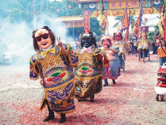 中新网2月16日电 据台湾《联合报》报道,“神明跳舞,超酷的!”屏东县“合修会”电音童子团15日到高雄县甲仙乡参加庙会,戴上大墨镜的每尊童子神像模样可爱,团员们卖力地随着电子音乐,整齐跳着“新版台中恰恰”,在场民众掌声没间断。