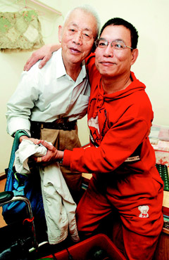 高龄87岁的胡伟爷爷(左)从小住孤儿院,在南京大屠杀劫后余生,30年来默默行善,昨天他捐款帮助行动不便的蔡行展(右),两人相拥如同父子。 台湾联合报图