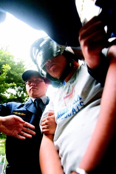 杀人嫌犯(图戴安全帽者)9日上午在台北市德行东路公寓杀害屋主简某,并造成简家一死两伤。图片来源:台湾《联合报》