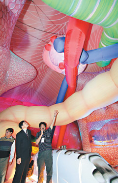 台中市文化局长黄国荣及纸风车剧团执行长李永丰,一起进入格列佛人体艺术馆,让大家一窥人体内部构造。