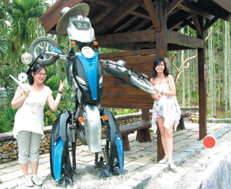 中新网6月26日电 据台湾《联合报》报道,南投县日月潭畔的鱼池乡武登村民石凯伦,将已废校的光明小学转型为生态旅游中心,营造特色环保意象,25日完成一座以6辆报废摩托车拆解零件创作的“环保变形金刚”,吸引路过游客停车参观,成了观光地标。