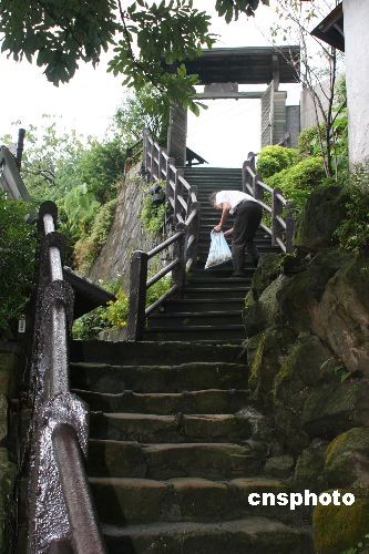 位于台北北投幽雅路三十四号的“禅园”,是座有百年历史的古木日式建筑。这里曾软禁过张学良将军。图为踏进“禅园”的大门必经陡峭的石阶。 中新社发 耿军 摄