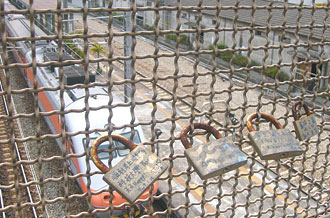 台中县丰原火车站后方老天桥有个求爱胜地,许多年轻男女在天桥上铁丝护栏挂上求爱锁。来源:台湾《联合报》